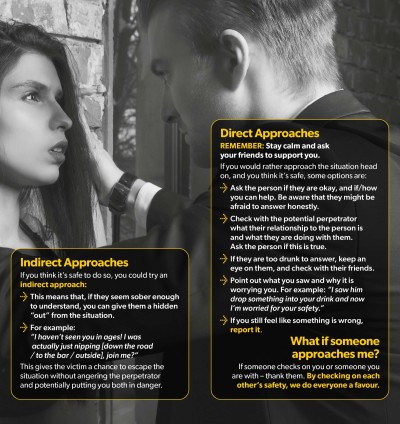 As someone in the community, when we are worried someone has been spiked or is in danger of being sexually assaulted, we want to help. This is called being a positive bystander. But often we worry we’ve misread the situation; that it’s not our place to speak up; or even that we might put ourselves in danger if we do.Checking that others are safe is always a good thing to do. If they are safe, and the person with them is looking out for them, then they should appreciate you checking in. But it can be hard to know how to approach these situations and sometimes people react badly to this.